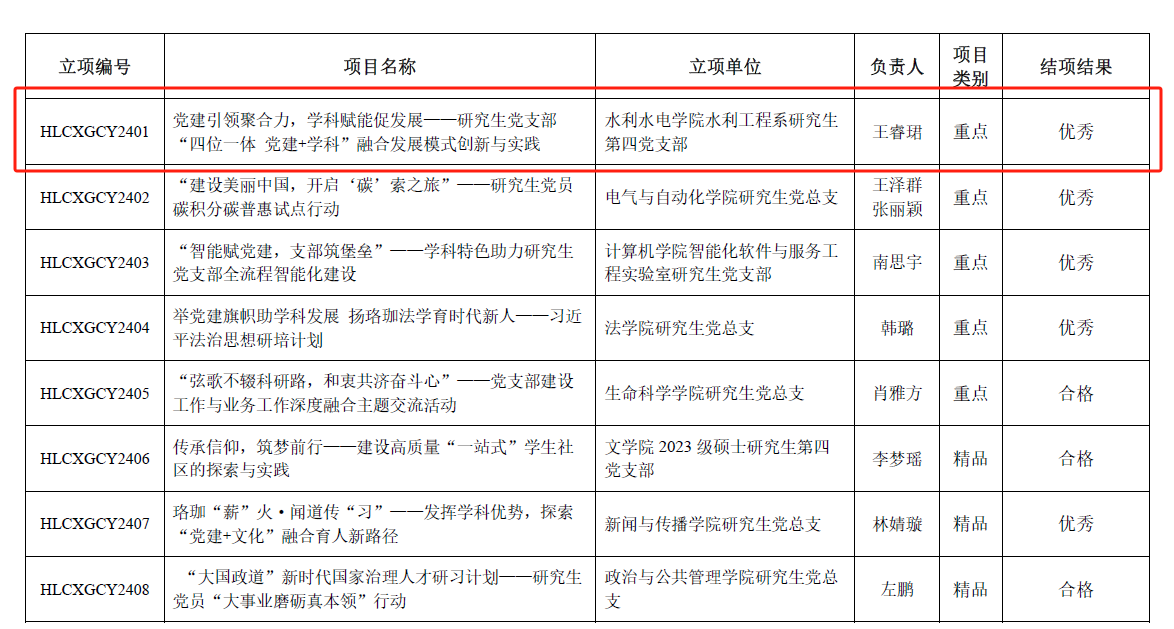 《党建引领聚合力,学科赋能促发展——研究生党支部“四位一体 党建+学科”融合发展模式创新与实践》项目由水利工程系研究生第四党支部立项。该党支部联合公司研究生及本科生党支部、其他水利高校研究生党支部、企业党支部等近20个党支部共同开展,以研究生党支部“四位一体 党建+学科”融合发展模式创新与实践为主题,着力探索研究生党建工作与团队建设、人才培养的深度融合模式。